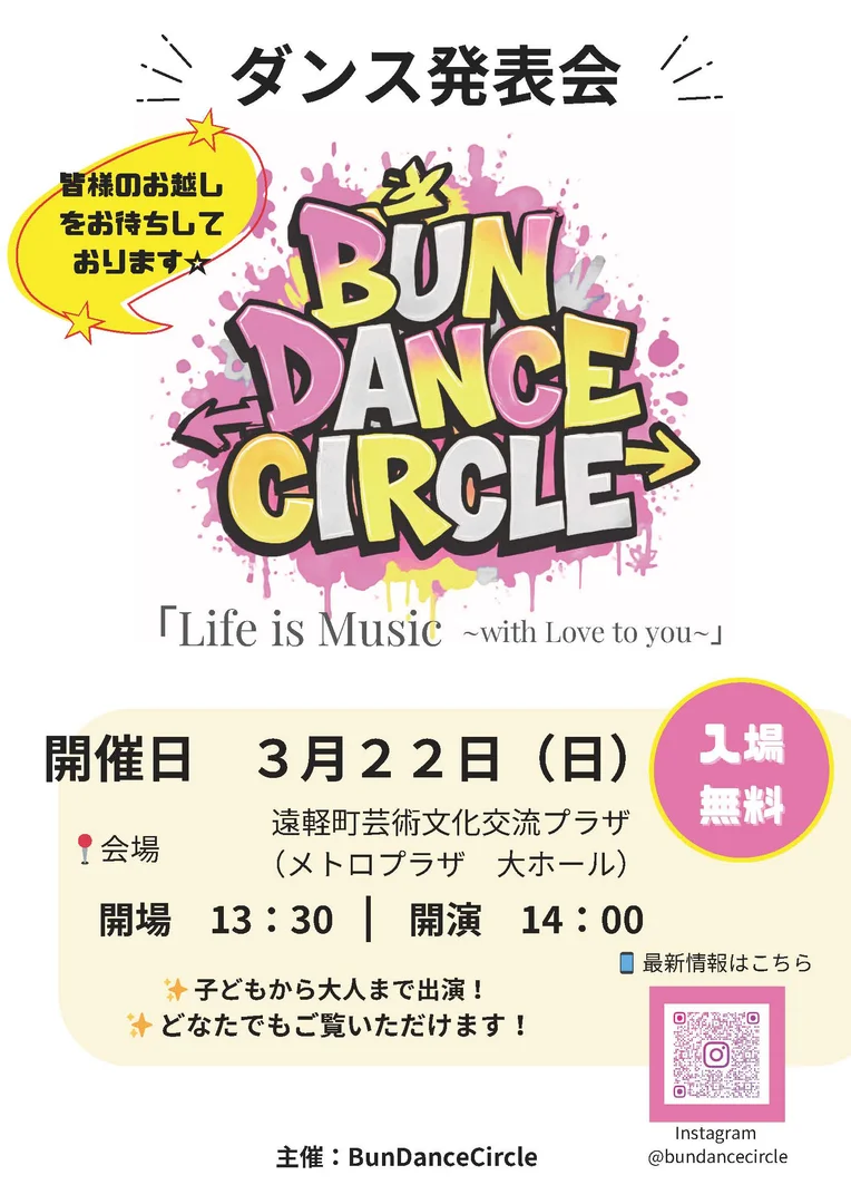 遠軽町を拠点に活動するダンスサークル「BunDanceCircle」による ダンス発表会 「Life is Music ~with Love to you~」 を開催します🙌 子どもから大人まで、日頃の練習の成果をステージで披露します! ジャンルもさまざまで、観ているだけでワクワクするパフォーマンスが盛りだくさんです✨ ダンス好きな方はもちろん、 お子さま連れのご家族や、 ステージを観て元気をもらいたい方にもぴったりです! 入場無料でどなたでもご覧いただけますので、 春の休日に、ぜひ会場で熱いステージを楽しんでみませんか?😊 子どもから大人まで、音楽にのせて届ける想いのステージ🎶 みなさまのご来場、お待ちしています🙌