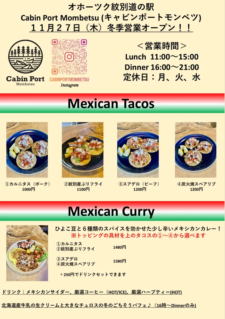 このイベントは終了しました冬季営業オープンしました!フード紋別市開催日2025-12-04時間11:00 - 21:00会場オホーツク紋別道の駅ボランティア募集募集なし参加費タコス1000円〜 メキシカンカレー1480円〜イベント詳細オホーツク紋別道の駅でメキシカンタコスとメキシカンカレーが食べれるお店を冬季営業オープンしました! 16時からは自家製生クリームのチュロスパフェを提供! 薪ストーブにあたりながらゆっくりお話できる憩いのお店です!その他・特記事項11月27日から冬期オープン‼詳細を見る