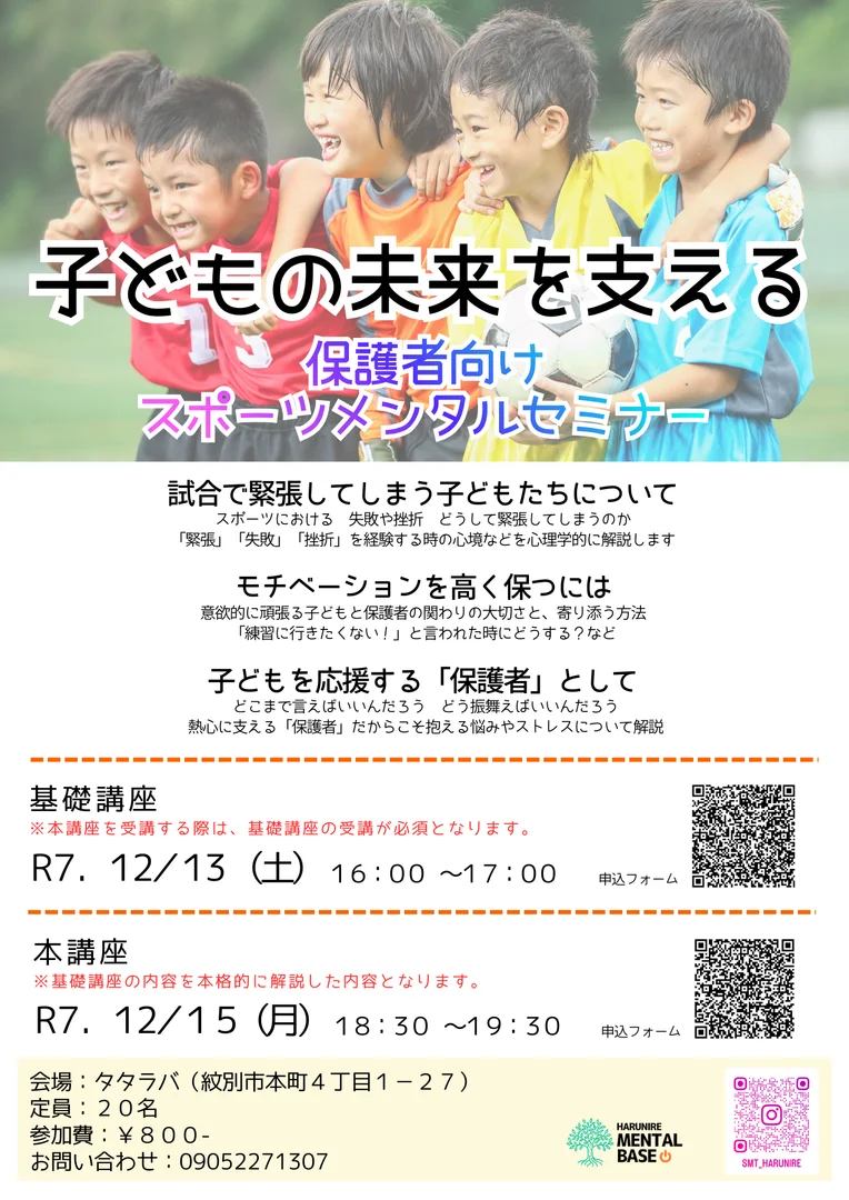 クラブ活動や部活動などスポーツに励む子どもを持つ保護者を対象としたスポーツメンタルセミナー「本講座」。 講師は紋別市内で整骨院を営む傍ら、地元サッカークラブチーム「JOGATURA」のチームトレーナーを務めるスポーツメンタルトレーナーの菊田拓希さんです。 「試合で緊張してしまう子どもたちについて」「モチベーションを高く保つには」「子どもを応援する保護者として」など、クラブ活動や部活といったスポーツに励む子の保護者として知っておきたい事柄を解説します。 ※本講座(12/15)を受講する際には、基礎講座(12/13)の受講が必須となります。 ------------------------------------------------- 【基礎講座】 <日時> 令和7年12月13日(土)16:00~17:00 <場所> まちなか交流スペース タタラバ (紋別市本町4丁目1-27) <定員> 20名 <受講料> 800円 【本講座】 <日時> 令和7年12月15日(月)18:30~19:30 <場所> まちなか交流スペース タタラバ (紋別市本町4丁目1-27) <定員> 20名 <受講料> 800円 <問い合わせ> HARUNIRE MENTAL BASE(TEL:090-5227-1307、Instagram:@smt_harunire)