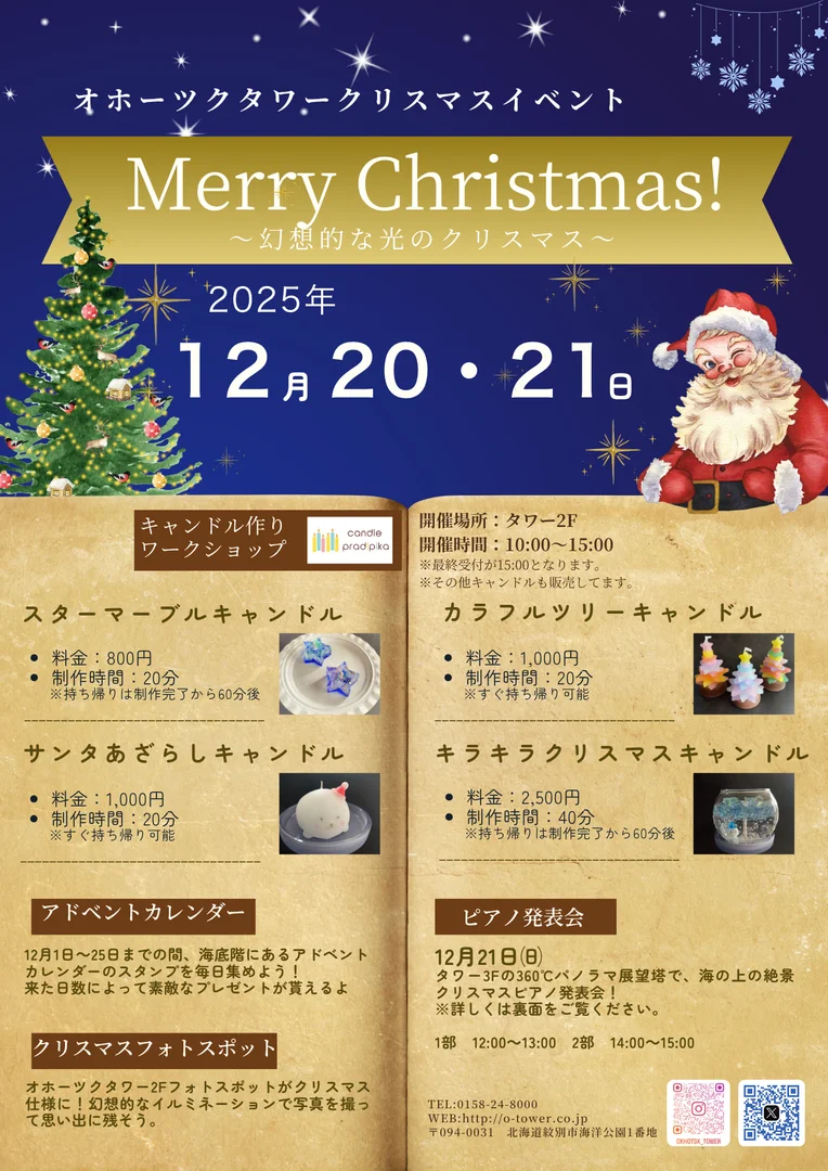 ◆ キャンドル作りワークショップ ◆ 開催場所:オホーツクタワー2F 開催時間:10:00~15:00 ・スターマーブルキャンドル 800円 ・サンタあざらしキャンドル 1,000円 ・カラフルツリーキャンドル 1,000円 ・キラキラクリスマスキャンドル 2,500円 ◆ ピアノ発表会 ◆ 開催日時:2025年12月21日(日) 1部 12:00~13:00/2部 14:00~15:00 開催場所:オホーツクタワー3F 定員:20名 応募締切:11月30日 参加費:1名 1,000円(税込)、観覧無料 申込:お申込はこちら