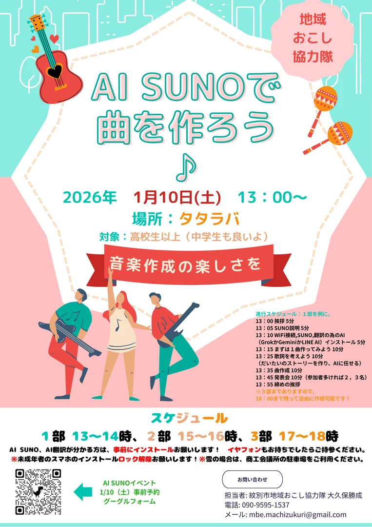 音楽生成AI「SUNO」を使って楽曲を作る体験イベントです。 講師は紋別市地域おこし協力隊の大久保勝成さん。 午後1時、午後3時、午後5時から各1時間、計3回開催されますが、複数回に参加することも可能です。