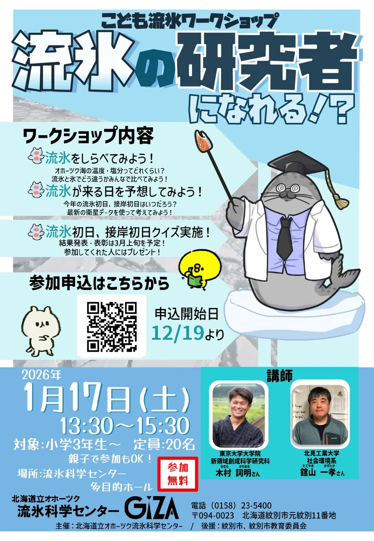 一昨年、昨年も開催したこども流氷ワークショップをさらにもっとグレードアップ! 東京大学の木村先生、北見工業大学の舘山先生をお招きして、今回は屋外調査を盛り込みます♪ 流氷がやってくるときのオホーツク海は一体何度くらいになっている?塩分はどれくらい?? まさに「流氷の研究者」のようなフィールドワークを組み込み、毎年行っている流氷初日の予測に役立てます(*'▽') 他にも流氷と氷の違いを調べる等…非常にマニアックな内容のワークショップです。