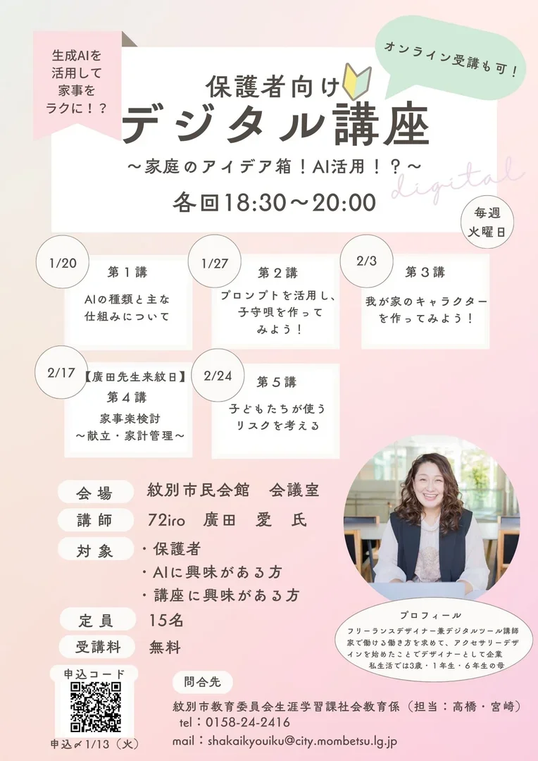 📱✨ 保護者向け デジタル講座(全5回シリーズ) ✨📱 生成AIを活用して、家事・子育て・家庭管理をもっとラクに! 家庭で役立つAIの基礎から、実践的な使い方までを学ぶ連続講座です。 ※オンライン受講も可能です。 【開催日時】 毎週火曜日 18:30〜20:00(全5回) ・第1講:1/20 AIの種類と主な仕組み ・第2講:1/27 プロンプトを使って子守唄づくり ・第3講:2/3 我が家のキャラクターを作ってみよう ・第4講:2/17 家事楽検討(献立・家計管理) ・第5講:2/24 子どもたちが使うリスクを考える 【会場】 紋別市民会館 会議室 【講師】 72iro 廣田 愛 氏 【対象】 保護者/AIに興味がある方 【定員】 15名 【受講料】 無料 【申込】 1月13日(火)まで(申込フォームより) AIを「知る」から「使える」へ。 ご家庭での活用を一緒に学びませんか?