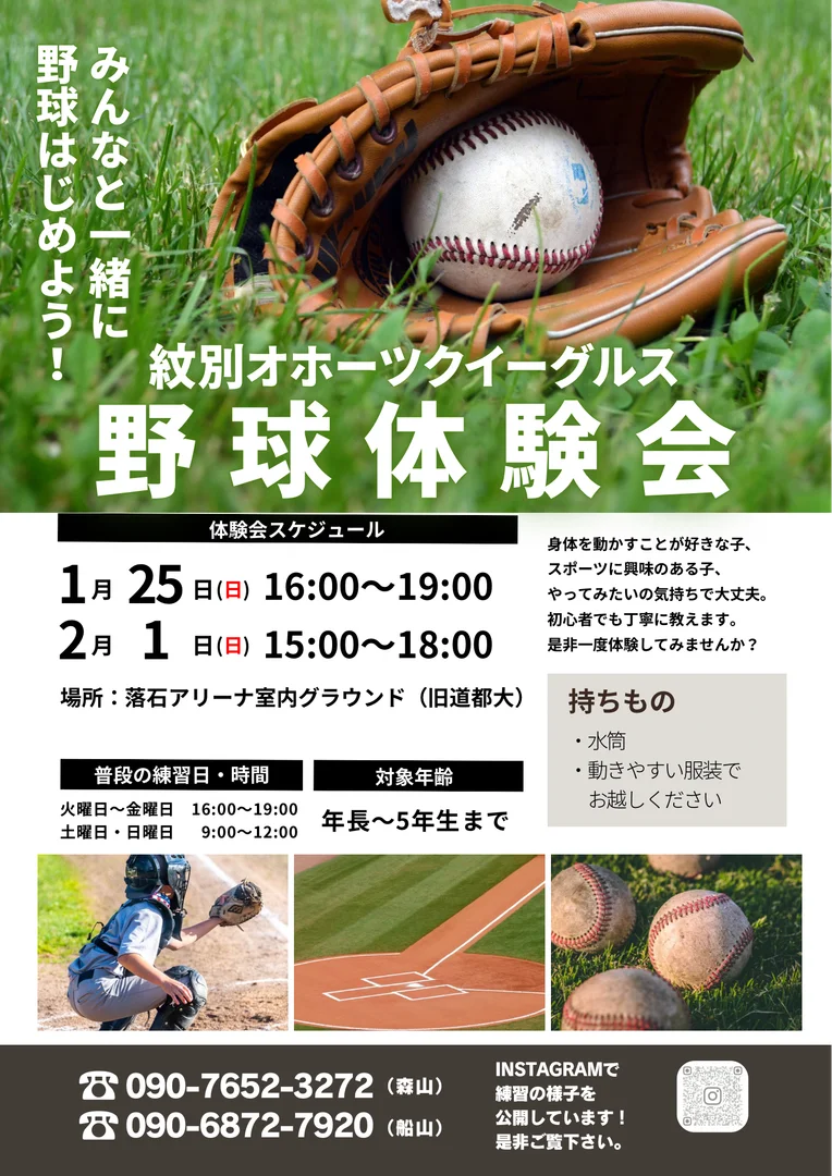 紋別市で活動する少年野球チーム「紋別オホーツクイーグルス」による、年長〜小学5年生向けの野球体験会です! ボールを投げる・打つ・走るといった基本動作を中心に、楽しみながら体を動かせる内容で行います🙌 野球が初めてのお子さま、運動がちょっと苦手なお子さまでも安心して参加できます! 「スポーツに興味がある」「何か新しいことを始めてみたい」 そんな気持ちがあれば大丈夫です✨ 男女問わず参加でき、経験豊富な指導者が一人ひとりに合わせて丁寧にサポートします! まずは気軽に、野球の楽しさを体験してみませんか?⚾️