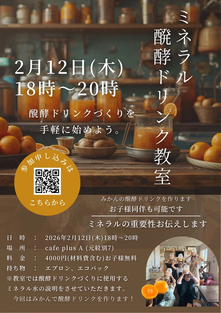 このイベントは終了しましたミネラル醗酵ドリンク教室講座紋別市開催日2026-02-12時間18:00 - 20:00会場cafe plus Aボランティア募集募集なし参加費4000円(材料費含む)シェアイベント詳細前半は座学、ミネラルの重要性、醗酵ドリンクとは何か楽しく学んでいただきます。 後半は実際に醗酵ドリンクを作ります。 およそ2kg分の醗酵ドリンクをボトルごとお持ち帰りいただきます♪その他・特記事項お子様同伴でご一緒に作ることも可能です。 当日はエプロン、エコバッグご持参ください。会場マップ