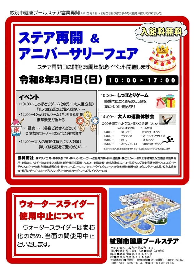 【10:30~】しっぽとりゲーム(幼児~大人区分別)時間内にたくさんのしっぽを集めよう!!〈景品あり〉 【12:00~】じゃんけんゲーム(全利用者対象)豪華景品が当たる ※昼食は各自ご持参してください※ 【2階飲食コーナー】「はらぺこ」も営業中 【14:00~】大人の運動体験会(大人対象)20分間フィットネス×4回×2会場(選び方は自由) ~フィットネス会場~ 【14:00~】ストレッチ 【14:30~】ピラティス 【15:00~】筋トレ 【15:30~】ステップエアロ ※ステップエアロは上靴が必要です ~プール会場~ 【14:00~】水中ウォーキング 【14:30~】ヌードルエクササイズ 【15:00~】スイミング 【15:30~】水中ウォーキング ※プールはスイミングキャップをお貸しします