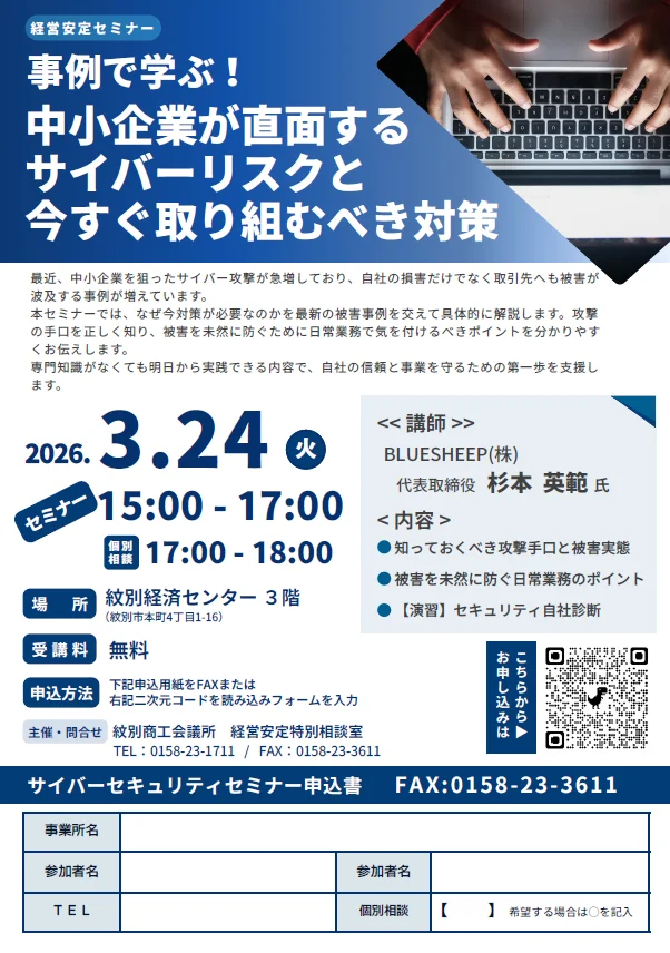 最近、中小企業を狙ったサイバー攻撃が急増しており、自社の損害だけでなく取引先へも波及する事例が増えています。 本セミナーでは、なぜ対策が必要なのか最新の被害実例を交えて具体的に解説します。 専門知識がなくても、明日から実践できる内容で、自社の信頼と事業を守るための第一歩を支援します。