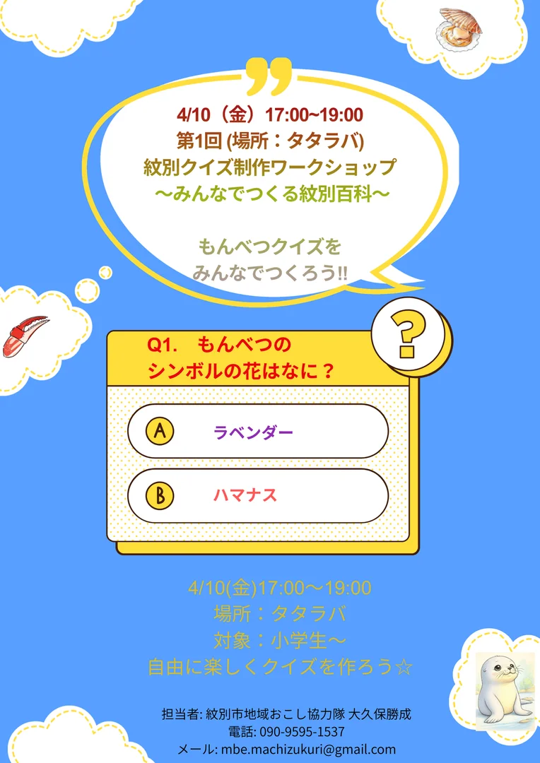 もんべつクイズをみんなでつくろう!!講座紋別市開催日2026-04-10時間17:00 - 19:00会場タタラバボランティア募集募集なし参加費無料シェアイベント詳細もんべつについてのクイズを、かんがえてつくりますその他・特記事項特にありません会場マップ