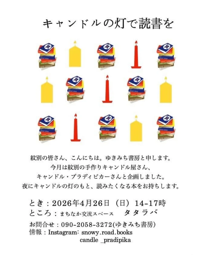 「キャンドルの灯で読書を」 こんにちは。出張本屋のゆきみち書房と申します。 今月は紋別の手作りキャンドル屋さん、キャンドル・プラディピカーさんと企画しました。 夜にキャンドルの灯のもと読みたくなる本と、春にぴったりなかわいらしいキャンドルの展示販売会です。 お気軽にお越しください。
