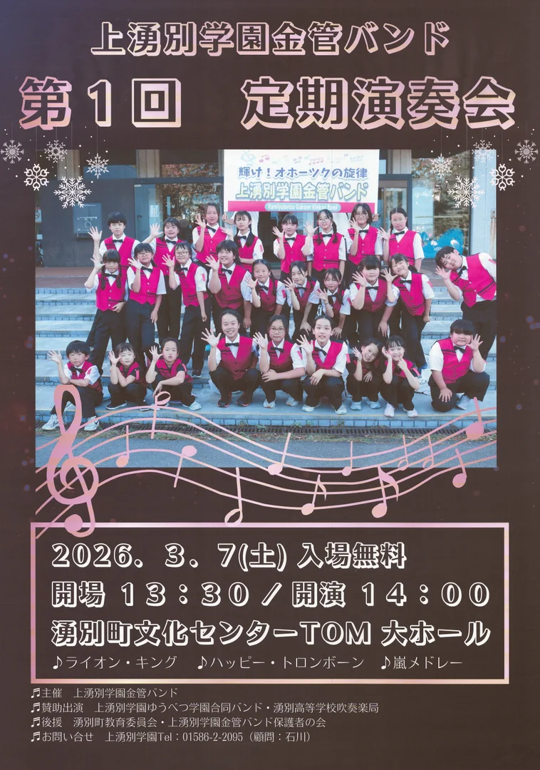 🎺✨ 上湧別学園金管バンド 第1回 定期演奏会 開催! ✨🎶 上湧別学園金管バンドによる、記念すべき第1回定期演奏会を開催いたします。 日頃の練習の成果を込めて、心をひとつに奏でるハーモニーをぜひ会場でお楽しみください。 当日は、 ♪「ライオン・キング」 ♪「ハッピー・トロンボーン」 ♪「嵐メドレー」 など、世代を問わず楽しめるプログラムをご用意しています。 入場無料ですので、ご家族やご友人をお誘いあわせのうえ、ぜひお気軽にお越しください。
