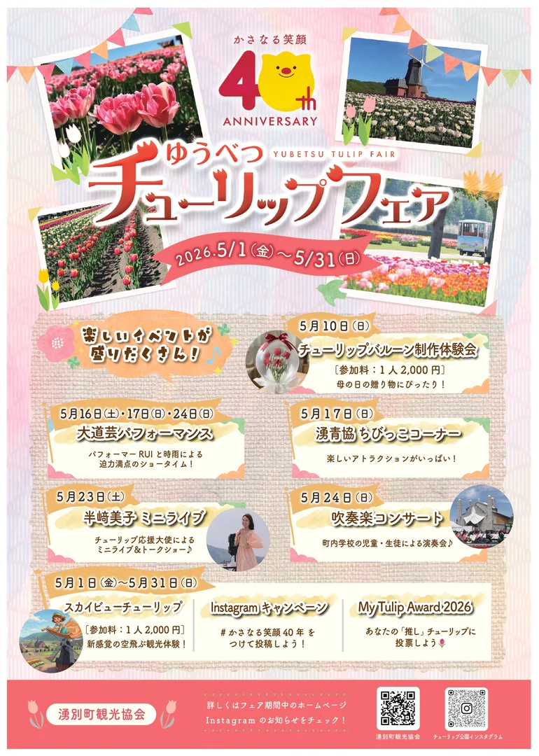 ゆうべつチューリップフェア期間中、来園者の皆様にお楽しみいただける多彩なイベントを開催します。 今年はフェア40周年を記念し、次のイベントを実施します。 「#かさなる笑顔40年Instagram投稿キャンペーン」5/1~31 会場内で撮影した写真にハッシュタグを付けて投稿すると、抽選で湧別町の特産品が当たります。 参加料:無料 「YUBETSU MY TULIP AWARD 2026」5/1~31 お気に入りのチューリップに投票が可能。人気品種は今後のフェア企画に登場するかもしれません。 参加料:無料 「チューリップバルーン制作体験会」5/10 母の日に合わせ、チューリップを使ったかわいいバルーンギフトを作り、大切な方へ贈ることができます。(先着100名) 参加料:1回 2,000円 「スカイビューチューリップ」5/1~31 チューリップ公園ドローン映像とクロマキー合成を活用し、まるで空を飛びながらチューリップ畑を巡るような体験をお楽しみいただける新感覚のアトラクション。 最後に撮影データをお渡しします。 参加料:1回 2,000円 ご家族やご友人と一緒に、ここでしか体験できない特別なひとときをお過ごしください。 皆様のご来園を心よりお待ちしております。